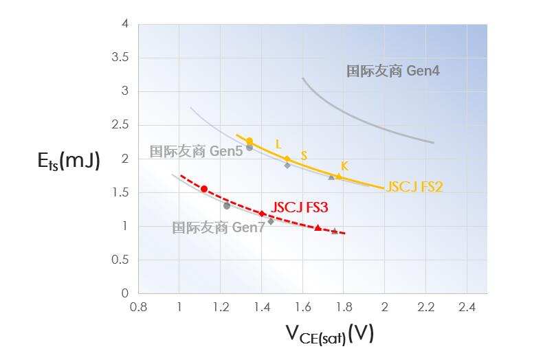 图1 相同的电流电压,不同代次芯片Vcesat&Ets表现「基于1200V/40A」