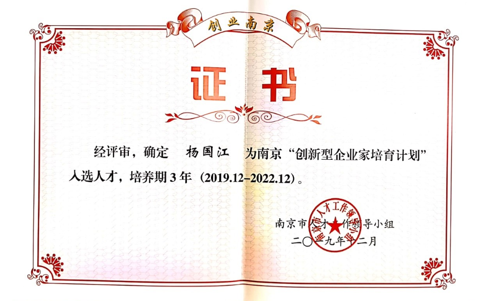 近日,公司杨国江董事长正式入选南京“创新型企业家培育计划”。